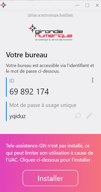 Utilisation et installation du logiciel "tele-assistance-gn.exe" sur le bureau